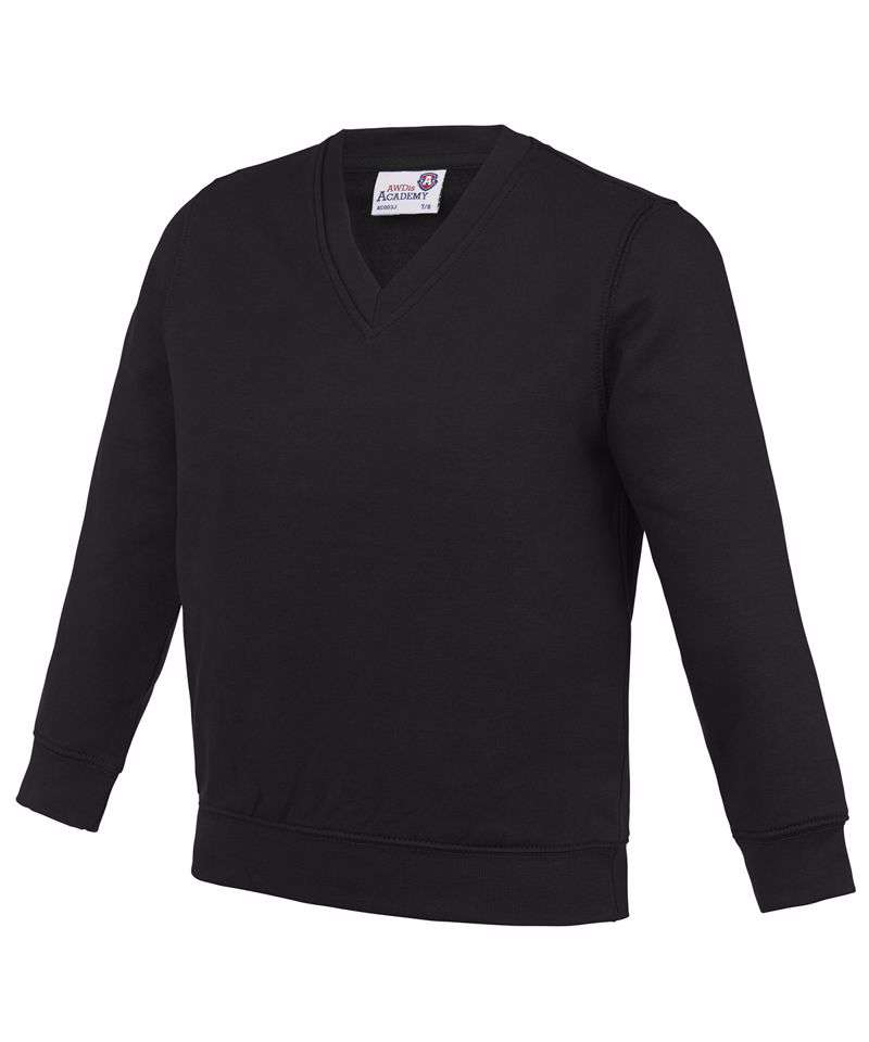 V-neckline sweatshirt. Ribbed neckline, cuffs and hemline. Soft cotton faced fabric creates ideal printing surface. Name label. Taped neck at back neck. Twin needle stitching for durability.