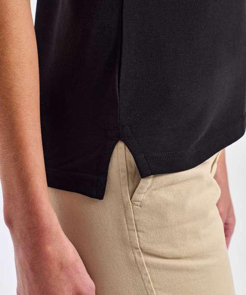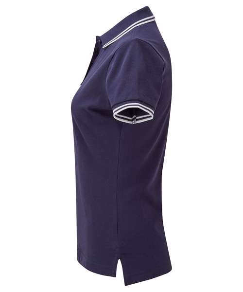 Fitted polo for women with tipped contrast detail to the collar and cuffs. Two contrast coloured buttons on placket. Contrast colour on side vents. Twin-needle stitching on hem. Ribbed knit collar and sleeve cuffs. Machine washable. Product contains no branded neck label. Removable Kimble or looped garment tags. Inner seam label holds important product information on one label with a second label containing brand information which can be cut-away. Please note old stock may contain a fixed branded label.