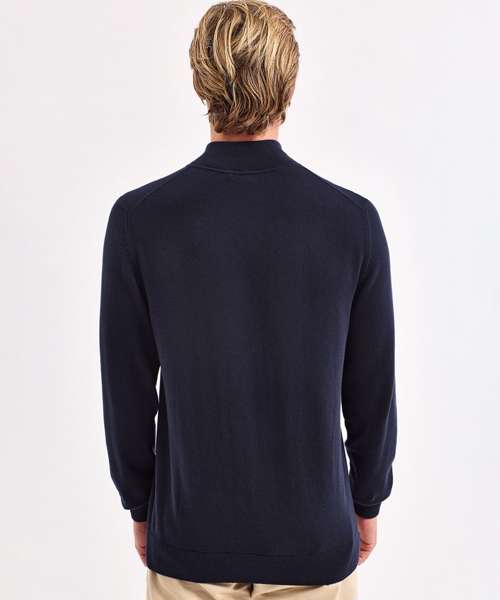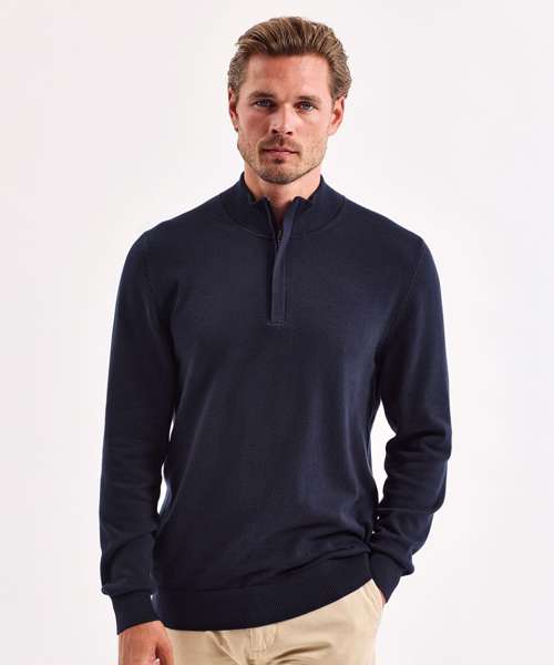 ¼ zip sweater. Decorative tuck stitching. Ribbed knit on the cuffs and hem. Product contains no branded neck label. Removable Kimble or looped garment tags. Inner seam label holds important product information on one label with a second label containing brand information which can be cut-away. Please note old stock may contain a fixed branded label.