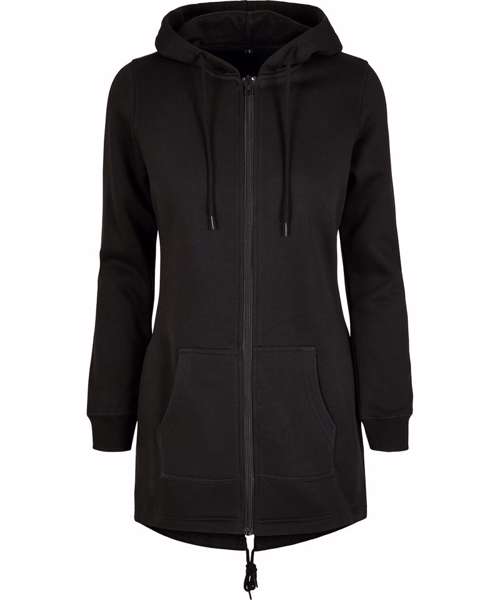 Comfortable basic zip-hoody for women in the style of a parka with extended back and hood. Great fit thanks to the drawstring hem and ribbed cuffs. The half-moon at the back neckline can easily be refined individually.