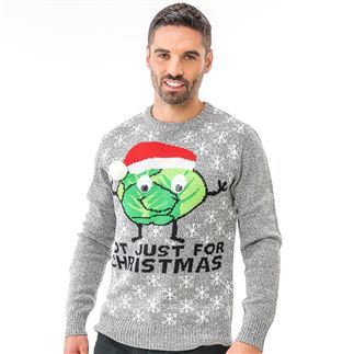 This is a brilliant novelty jumper for fans of the humble Brussel sprout. A bright and colourful cheeky sprout face with Santa hat with white pom-pom, with caption 'Not just for Christmas'. It's sure to be family favourite. .