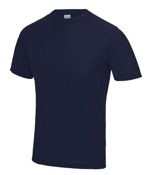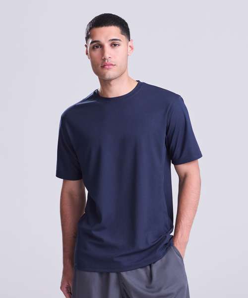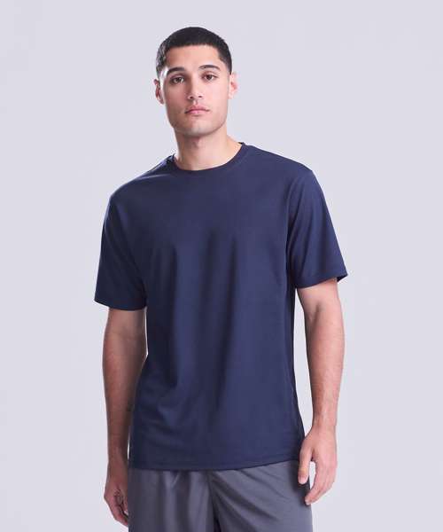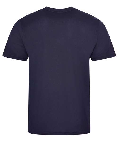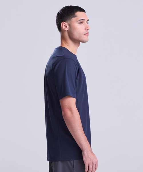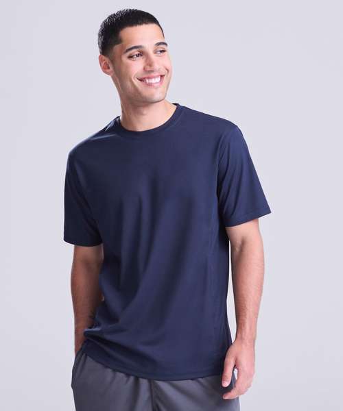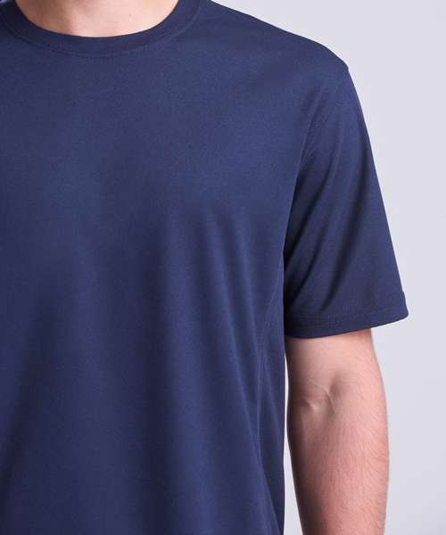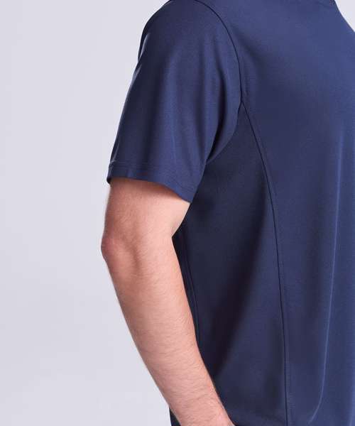 Self-fabric crew neck. Set in sleeve design. Half moon yoke. Self-fabric side panels. Enhanced SuperCool fabric with superior wicking properties and anti-bacterial finish. Self-fabric sapphire blue taped back neck. Twin needle stitching detail. Simple tear off label makes it perfect for rebranding. UPF 30+ UV protection.