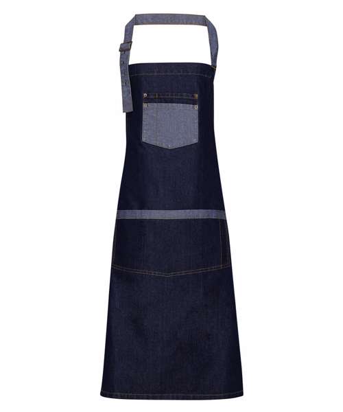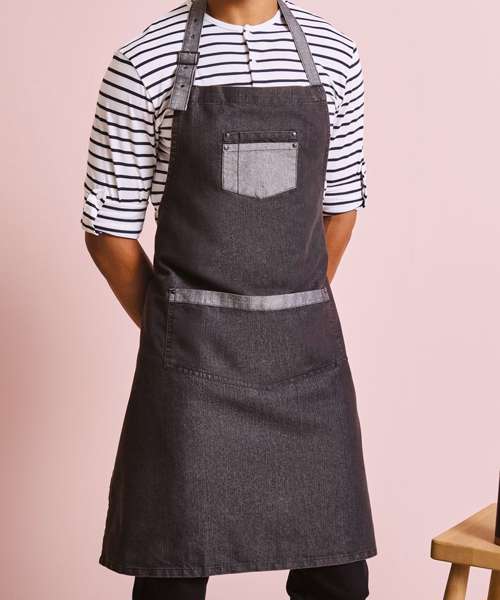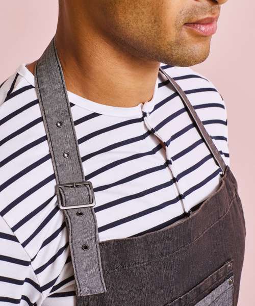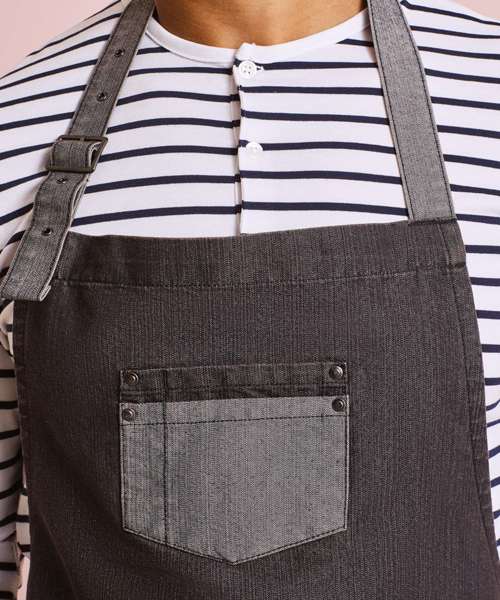 A quirky addition to the denim range, this bib apron gives an 'industrial-chic' feel to service with large gun metal eyelets securing the ties in place. The shade on the underside forms the contrast trim detail on the pocket and ties for a great reversible effect.