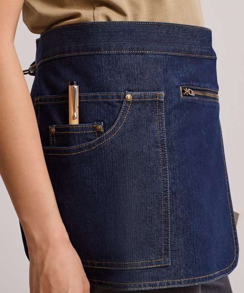 Hip apron with adjustable self-fabric waistband. D-ring and carabiner fastenings. Jeans style stitched pockets. Zipped pocket.