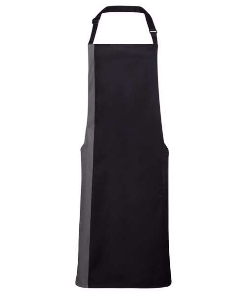 Classic Premier bib apron with contrast coloured panel. Self fabric neck. Self fabric ties 90cm long, width 72cm, length 86cm. 60°C domestic wash. Sliding adjusting buckle. Two front side pockets with slanted opening.