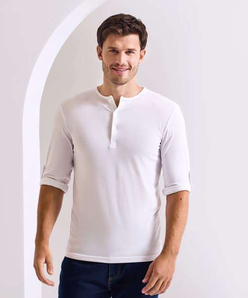 Long sleeve tee that has roll sleeve capabilities with button tab on the inside of the sleeve to secure in place. Round neck style with three a button placket. Twin-needle stitching to the hem and cuff.