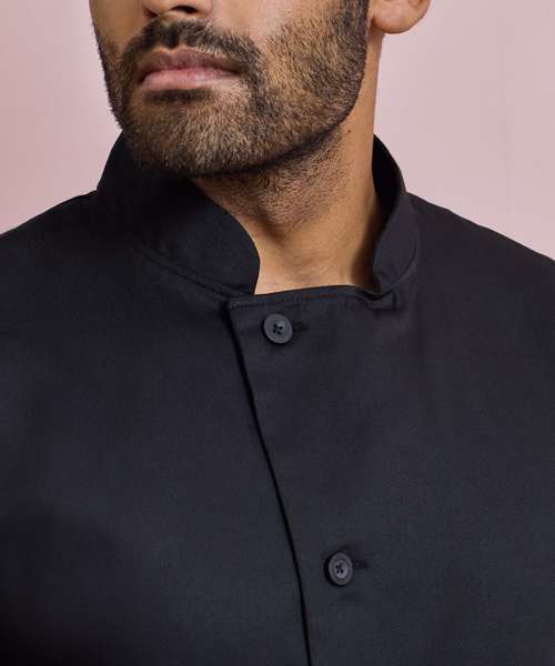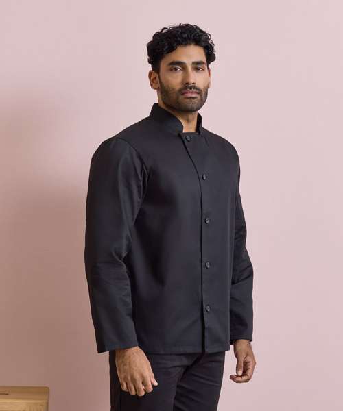 A durable long sleeve chef's jacket that fastens down the right hand side of the body with five long life resin buttons. On the upper left sleeve there is a handy double pocket pen compartment. This jacket is styled with a mandarin collar and is available in Black and White and offers great value for money.