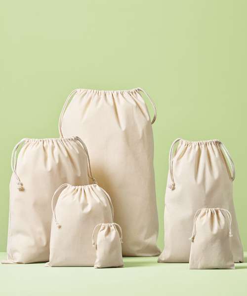 Stuff bag made from recycled cotton. Double drawcord closure. 150gsm. Natural pull ties.