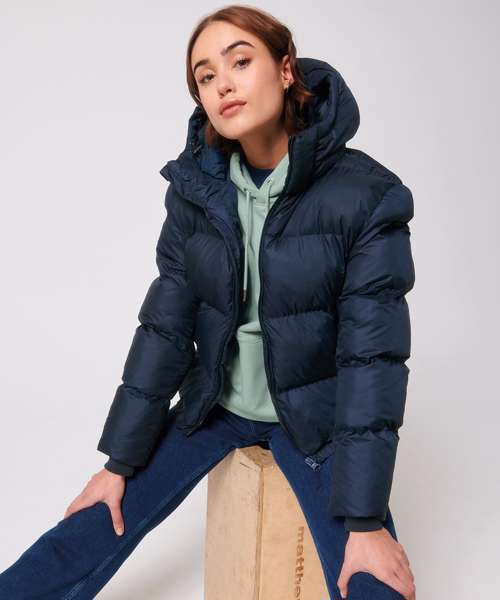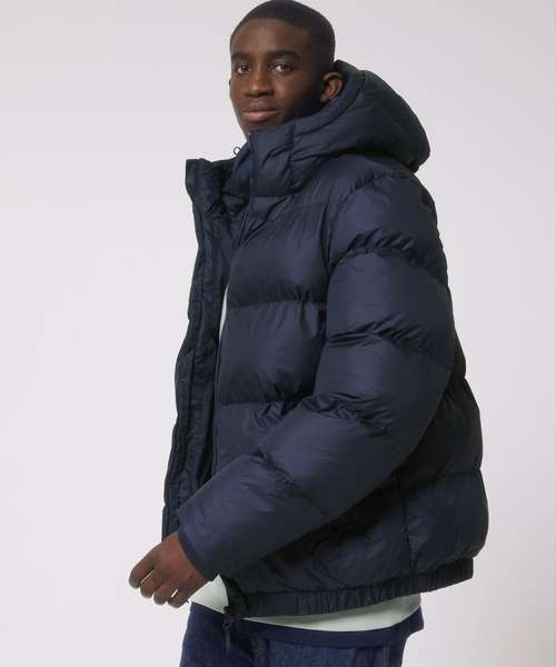 Oversized puffer jacket. Set-in sleeve. 1x1 rib at sleeve cuff. Elastic bottom hem. Lined hood with adjustable plastic stoppers and elastic cords on inside. Nylon zip at centre front with chin guard. Zipped welt pockets with extra grosgrain tape. Self-fabric half-moon at back neck. Inside zipped chest pocket. Grosgrain straps on inside for versatile and hands-free carrying. Inside zip opening at bottom hem and wearer’s left chest for easy decoration.