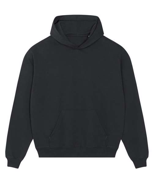 Unisex boxy dry hand-feel hoodie sweatshirt. Set-in sleeve. Double-layered hood in self-fabric. Inside single Jersey back neck tape. Self-fabric half-moon at back neck. Single needle topstitch at neckline and along hood opening. 2x1 rib at sleeve hem and bottom hem. Armhole, sleeve hem and bottom hem with twin-needle topstitch. Kangaroo pocket at front.