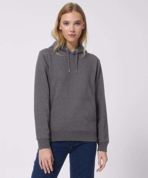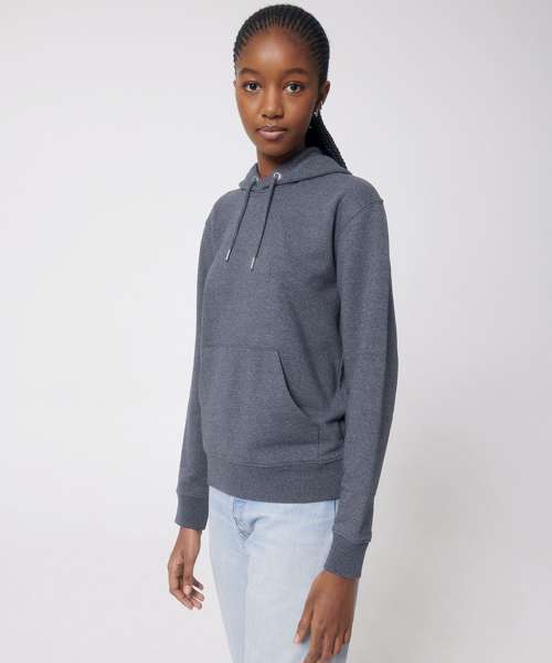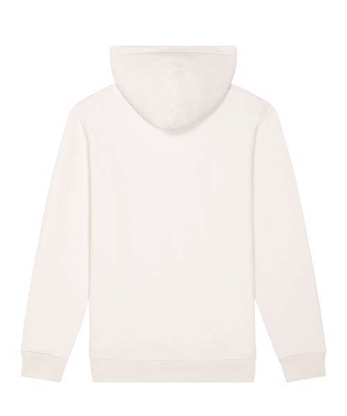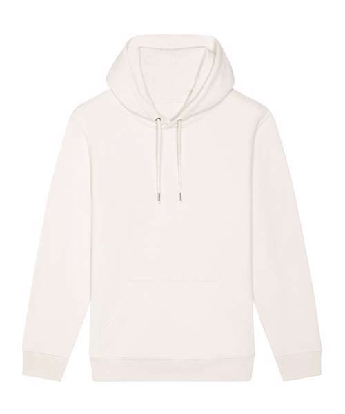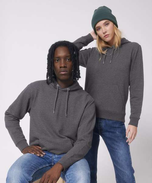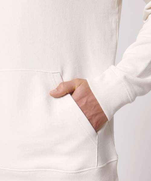 Unisex recycled hoodie sweatshirt. Made from in-house organic cutting waste. Set-in sleeve. Double-layered hood in self-fabric. Round drawcords in matching body colour with metal tipping. Metal eyelets. Inside herringbone back neck tape. Self-fabric half-moon at back neck. Single needle topstitch at neckline and along hood opening. 1x1 rib at sleeve hem and bottom hem. Armhole, sleeve hem and bottom hem with twin needle topstitch. Kangaroo pocket at front. The recycled fibres make the fabric surface less smooth.