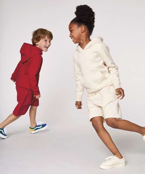 Kids jogger shorts with self-fabric elastic waistband and round drawcords in matching body colour with metal tipping. Embroidered eyelets.