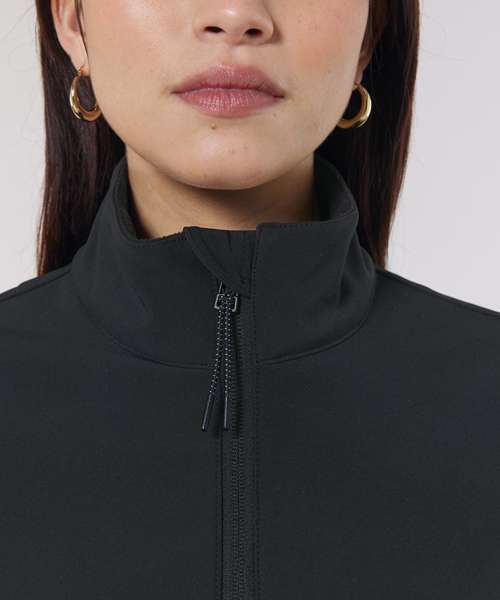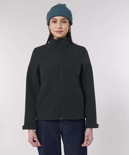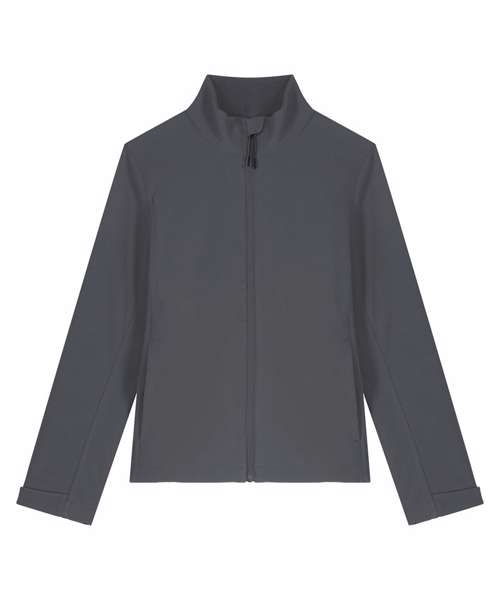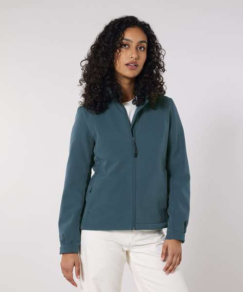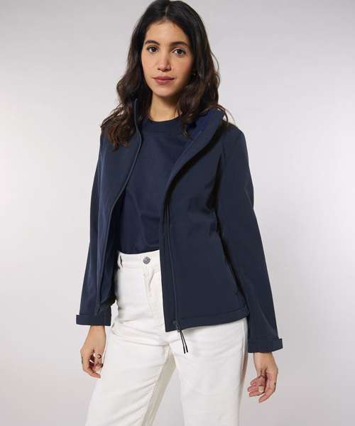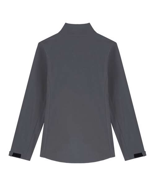 Women’s softshell jacket, medium fit with a high collar and set-in sleeve. Bottom hem with adjustable plastic stopper and elastic cord. Reverse nylon zip at centre front. Zipped outside welt pockets with reflective elastic puller. Fully bonded inside fleece layer. Side panels and stretch for better shape. Adjustable hook and loop sleeve opening. Inside seams finished with recycled binding. Water-repellent up to 10,000mm, breathability up to 3000G/M2/24hrs allowing perspiration to escape. Windproof. Bionic ECO DWR (durable, water-repellent) finish.