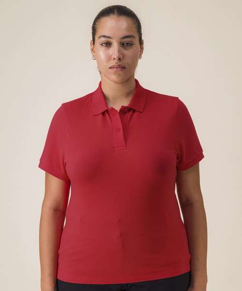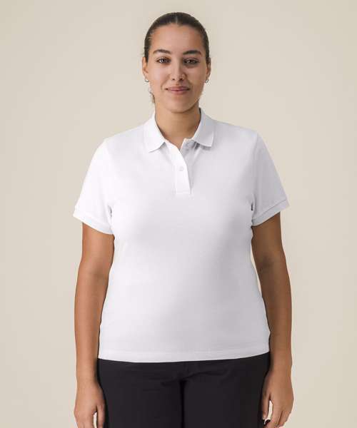 The Stella Coaster mid-light polo for women. Fitted. Set-in sleeve. Flat knit rib on collar and sleeve hem. Inside heavy single Jersey back neck tape. Front inserted placket with two buttons in matching body colour. Slit and bartack finish at side seam hem. Single-needle topstitch at shoulder seams. Bottom hem with narrow double-needle topstitch.