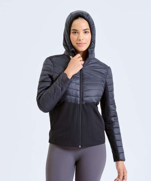 Hybrid jacket with diagonal quilted upper chest and back. Lower jacket is shell fabric. Full zip-through style with panelled hood. Hood is elasticated for a snug fit. Front pockets. Quilted detailing to arms with lower arm in shell fabric. Internal storm flap with zip guard. We recommend using block out vinyl and inks.Product contains no branded neck or waist label. Removable Kimble or looped garment tags. Inner seam label holds important product information on one label with a second label containing brand information which can be cut-away.