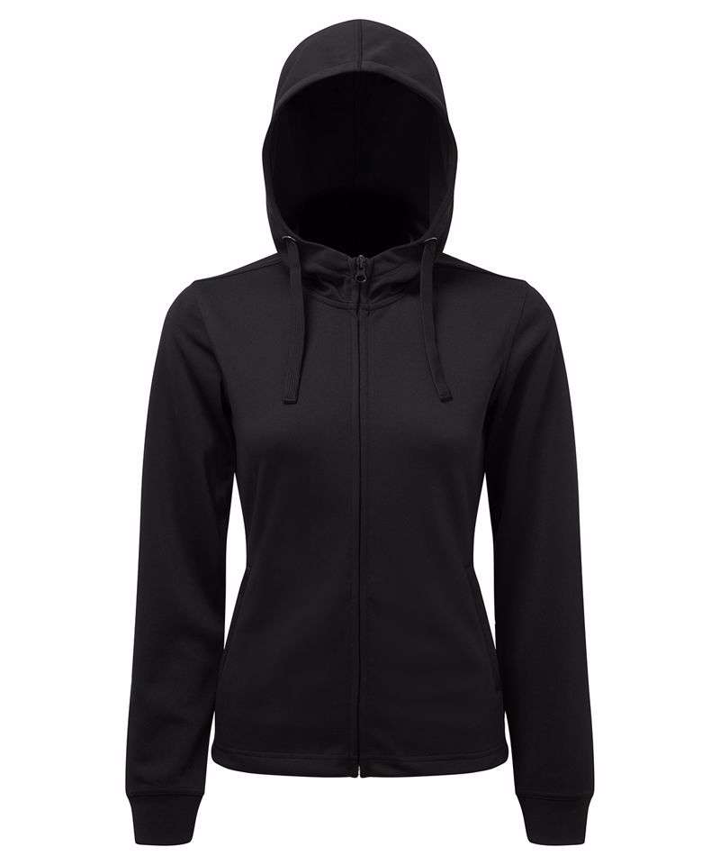 Hooded jacket with chin guard. Full zip-through. Concealed centre zip and zip pockets. Drawstring cord fastenings to hood with chrome eyelets. Double-panelled hood. Feminine fit. Cuffed sleeves. Made with recycled polyester, Spun dyed technology. Spun dye melts colour pigments and recycled polyester together, creating coloured fibres using fewer chemicals, less water and less CO2. Spun dye fabric also improves the colour-fastness of garments. We recommend using block out vinyl and inks.