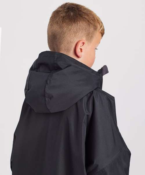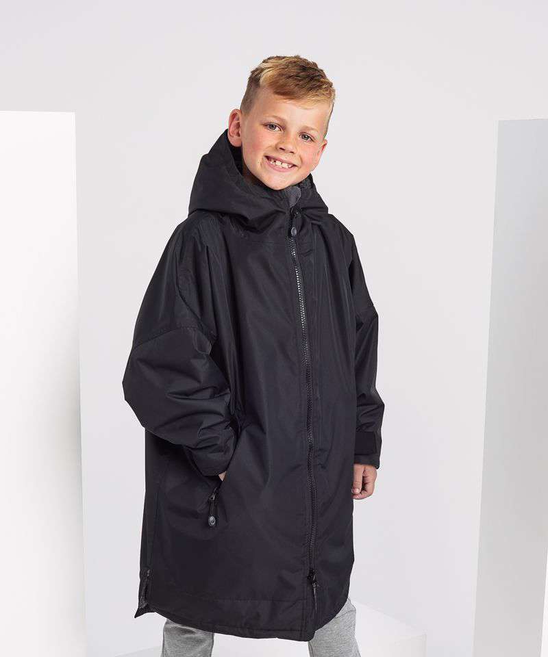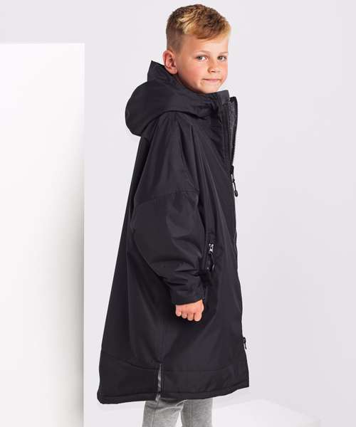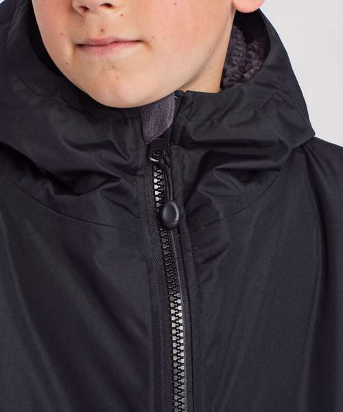 Unisex. Oversized. Full-length two-way plastic zip with easy pull toggles. Chin guard. Oversized fit. Side vents. Adjustable cuffs with hook and loop fastening. Side zip pockets. Inside pocket with zip on the left side. Inside patch pocket on the right side. 3-panelled hood. Loop on the centre back of the jacket for hanging the robe. Dropped back hemline. (5000/5000 waterproof and windproof). Embroidery access to the back and chest area can be accessed through here. Waterproof taped seamed outer layer. Sherpa fleece interior. Rebrandable stuff sack carry bag with double drawstring straps. CE Class 1 Certified.