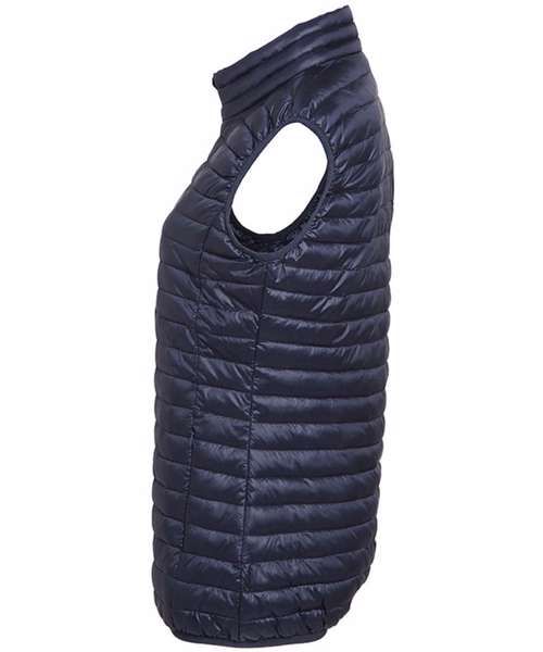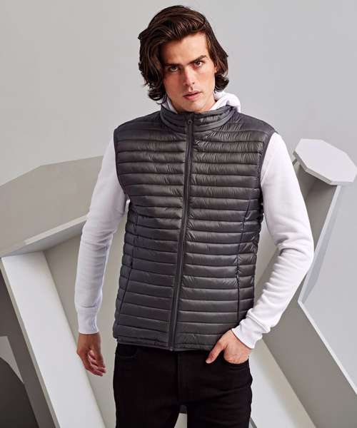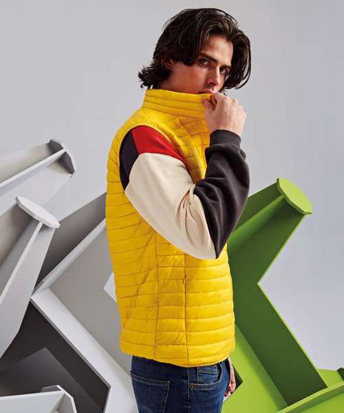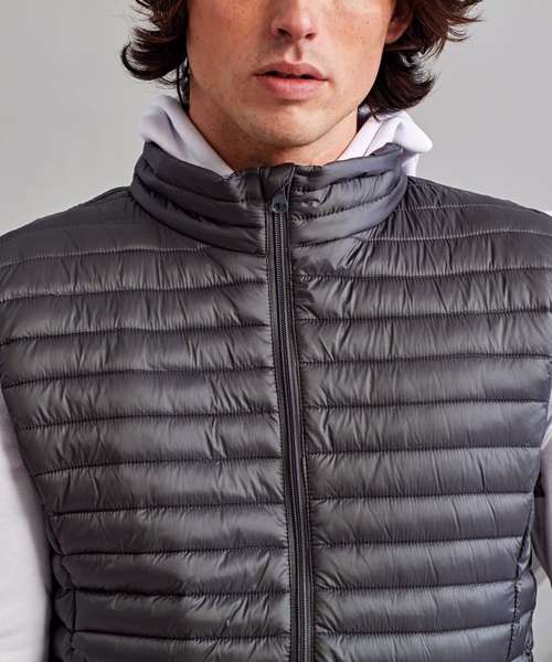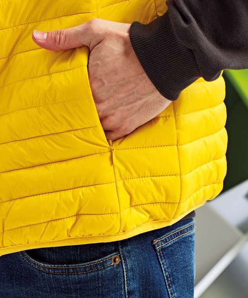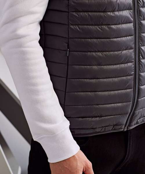 Tonal coil zip on centre front with signature zip puller and internal storm flap and chin guard. Horizontal stitched sandwiched narrow baffles. 250gsm lightweight polyester fill. Internal binding on all seams. Internal back neck hanger loop. Concealed zipped pockets with teardrop pullers. Stretch binding around armholes and hem for added protection. Packable bag. Product contains no branded neck label.* Removable Kimble or looped garment tags. Inner seam label holds important product information on one label with a second label containing brand information which can be cut-away.