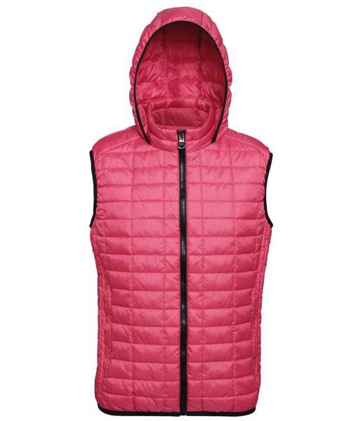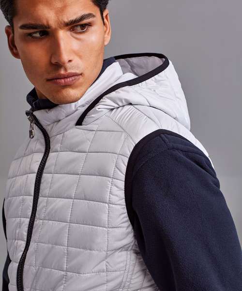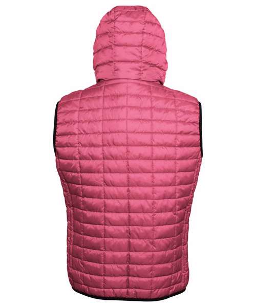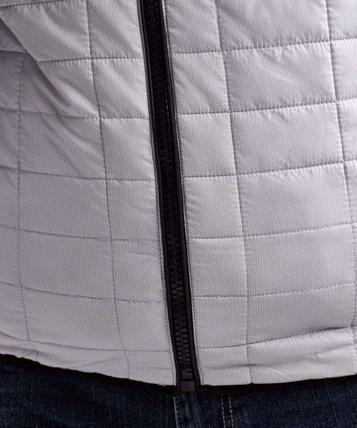 Contrast coil zip on centre front with signature zip puller and mouse tail piping on each side of zip opening. Front and back square stitched baffles with linear side narrow baffles. 250gsm lightweight polyester fill. Fully-lined in tonal polyester. Inset welt pocket with concealed zip opening and double zip garages. Contrast stretch binding on hem, armholes and hood opening. Internal piping around inside facing. Secure hood attached to collar. Internal welt pocket. Internal zipped opening on back panel for embroidery access. Product contains no branded neck label.* Removable Kimble or looped garment tags. Inner seam label holds important product information on one label with a second label containing brand information which can be cut-away.