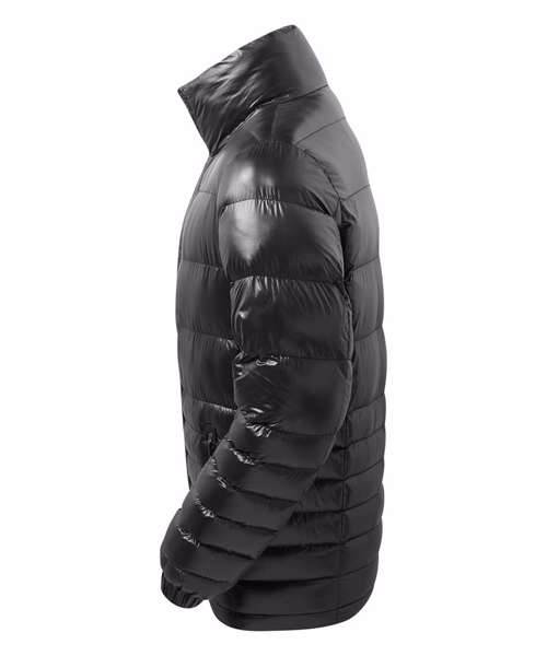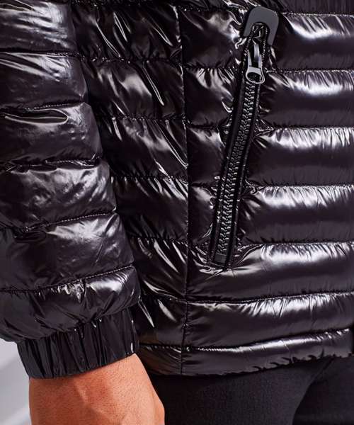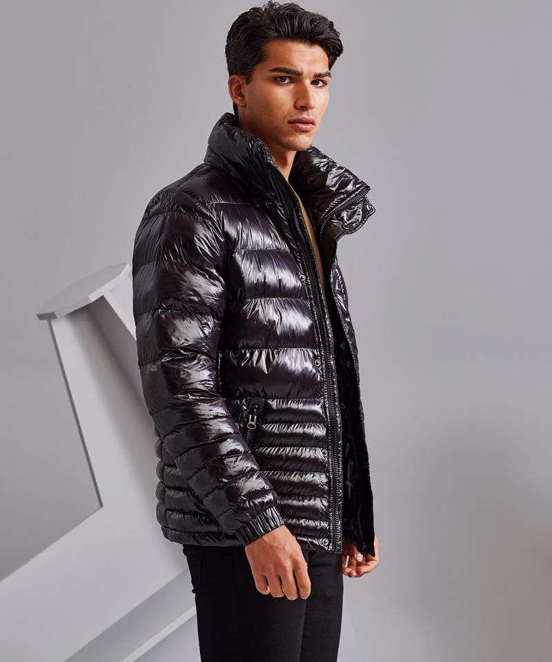 Wide external central storm flap with concealed coil zip, signature zip puller and internal storm flap with chin guard. Chunky rubberised stud fastenings on centre front. Horizontal stitched graded baffles. 245gsm polyester fill. Fully-lined in polyester matt finish. Self elasticated cuffs. Tonal coil zipped pockets with upper zip guard and self fabric piping around edges with rubberised edge trim. Glossy high shine face fabric. Internal double jet chest zipped reverse coil pocket. Product contains no branded neck label.* Removable Kimble or looped garment tags. Inner seam label holds important product information on one label with a second label containing brand information which can be cut-away.