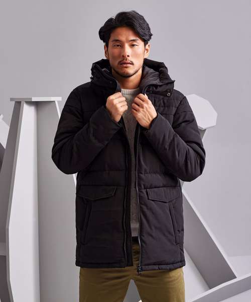 Warm, versatile, multi-baffled jacket. Centre front zip and storm flap, attached hood with additional popper fastenings. Warm polyfill quilted lining. Two zip front pockets and two pockets with popper fastenings. Inner adjusters and hood adjusters for a snug fit to lock in warmth. Inner phone pocket. Embroidery access. Product contains no branded neck label.* Removable Kimble or looped garment tags. Inner seam label holds important product information on one label with a second label containing brand information which can be cut-away.